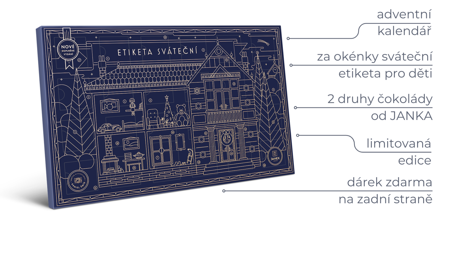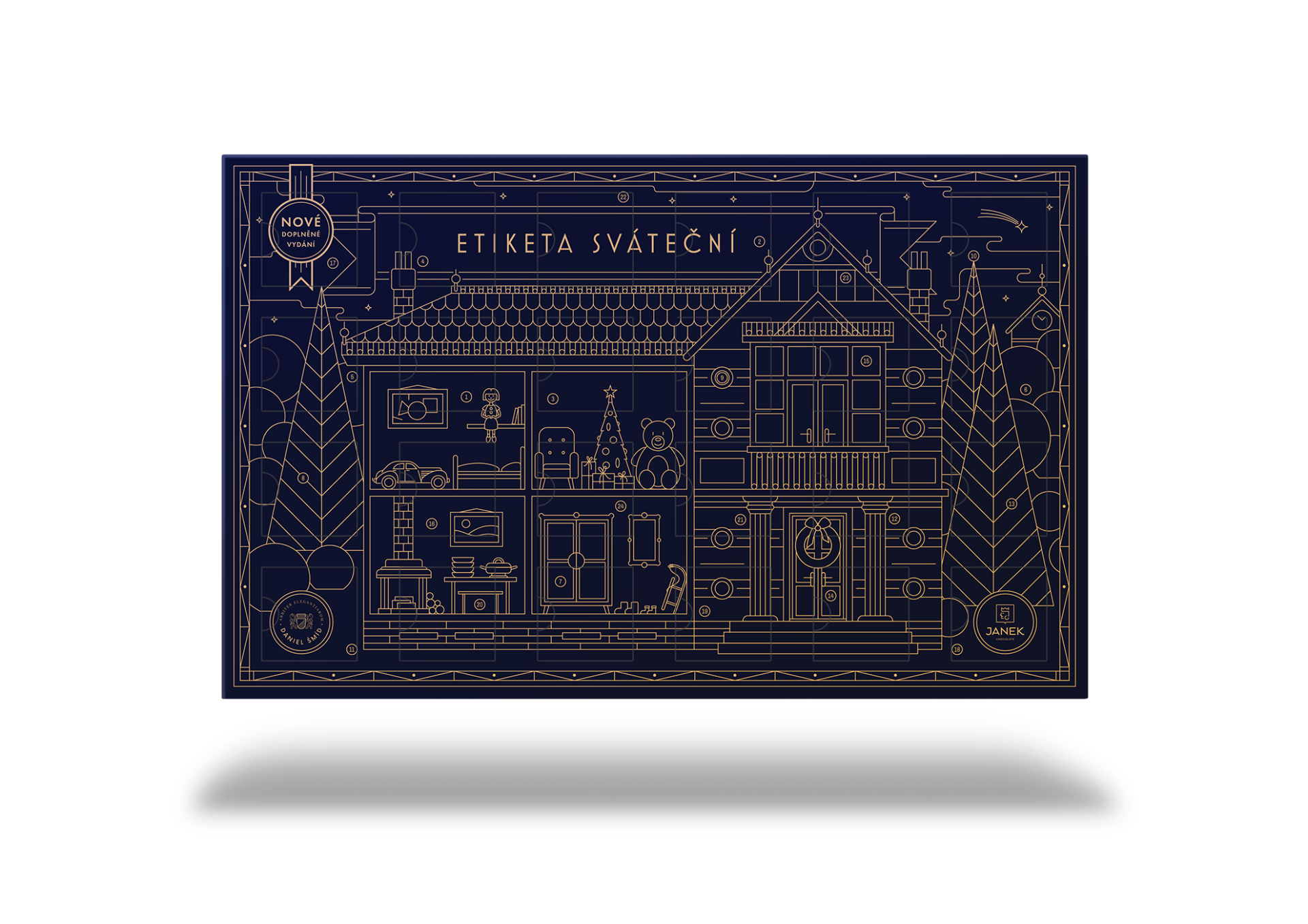 Unikátní návrh obalu pro děti vytvořil grafik Petr Domorád, který do něj skryl desítky symbolů dětského světa a 24 čísel k ukrácení času do Vánoc. Můžete si s dětmi hrát. Kolik je hodin? Kde jsou pohádkové knihy a kolik má dům věžiček?