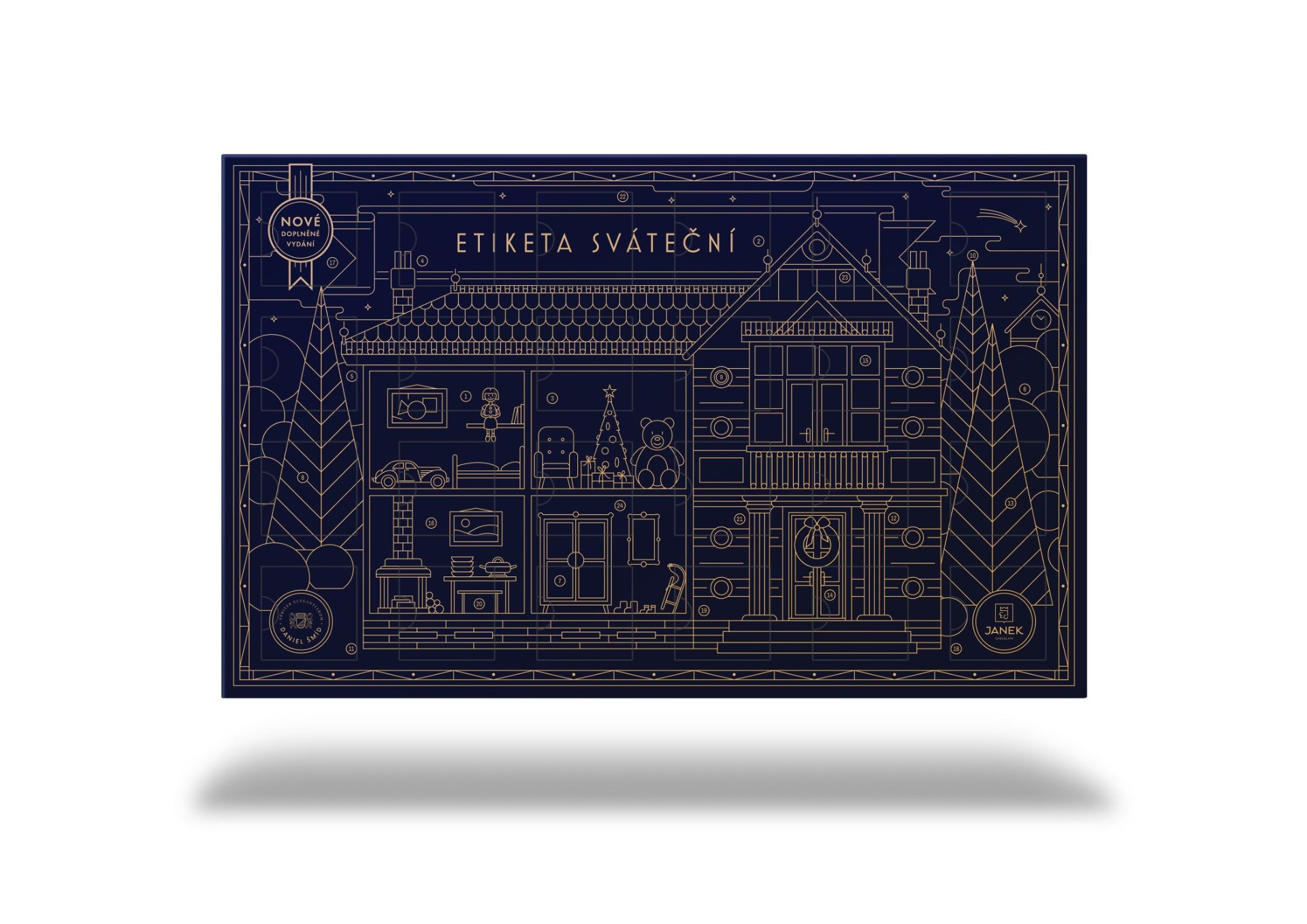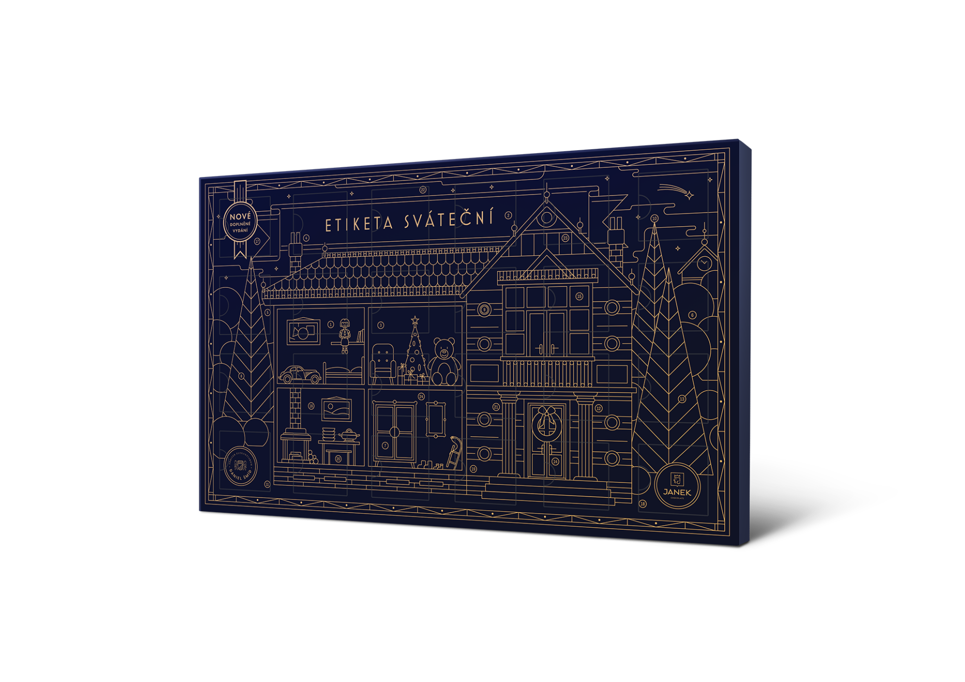 Unikátní návrh obalu pro děti vytvořil grafik Petr Domorád, který do něj skryl desítky symbolů dětského světa a 24 čísel k ukrácení času do Vánoc. Můžete si s dětmi hrát. Kolik je hodin? Kde jsou pohádkové knihy a kolik má dům věžiček?